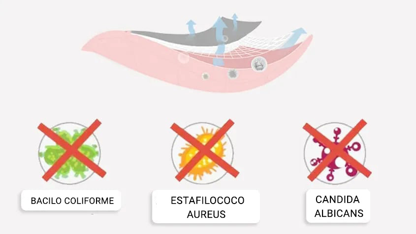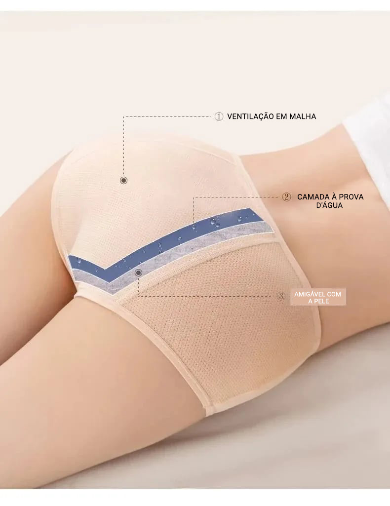 Nossas calcinhas possuem um material recém-desenvolvido de proteção antibacteriana e absorção de umidade que ajuda a absorver líquidos para manter você seca e segura, proporcionando conforto durante todo o dia.