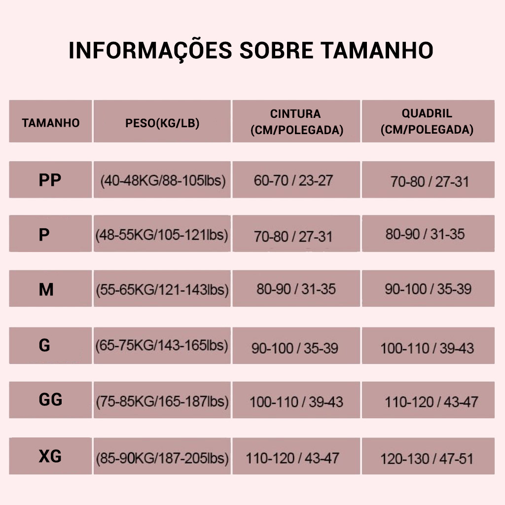 Se você não souber o tamanho da sua calcinha, pode encomendá-la de acordo com o peso. Você também pode encomendá-la de acordo com a tabela de tamanhos.